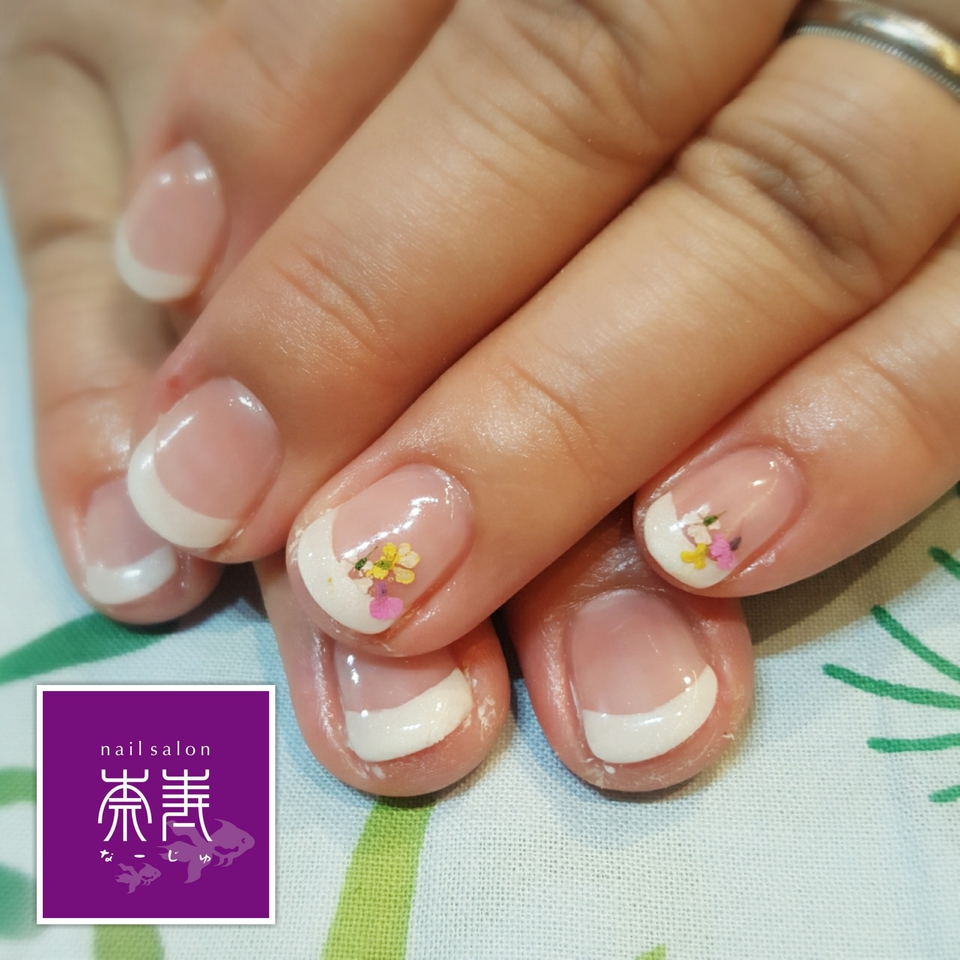 ピンクは2種類!ホワイトベースのネイルに押し花を散らせてます☆
