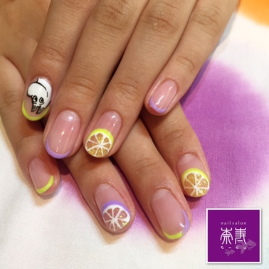 パープルとイエローのフルーツ。 さらにキャラクターもあわせてポップなネイルになりました♡
