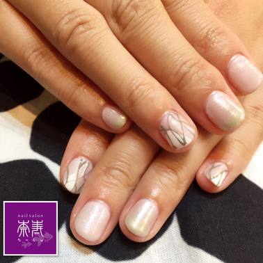 パールピンクベースにホワイトの変形フレンチ+グレーのラインアート、シャンパンゴールドのフレンチいは上からミラーネイルを施しています!