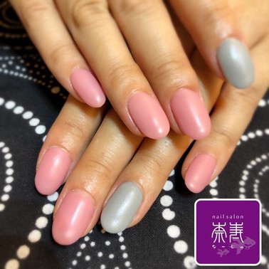 ピンクとグレーのシンプルワンカラーを マット仕上げで。 ●お肌の色は関係なし ●ショートネイル、ロングネイルの方 ●シンプルなネイルがお好みの方に オススメのネイルです。 当てはまらない方でも、このネイルをされたい方は 色味やデザインを少し変えるだけで似合うネイルになります! お気軽にスタッフにご相談ください。