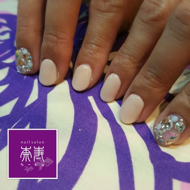 ヌードベージュにクリアホワイトを混ぜたらとてもキレイな人になりました! 1本ずつオリジナルパーツとストーンを組み合わせたビジューネイルを☆