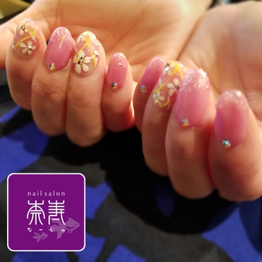お花の下のベースはクリアにピンクとラメで軽い雰囲気を出し、お花やイエローラインで舞っているようなお花をイメージしました。奈寿のアートサンプルをお客様の雰囲気にあわせてアレンジさせていただいたネイルです。