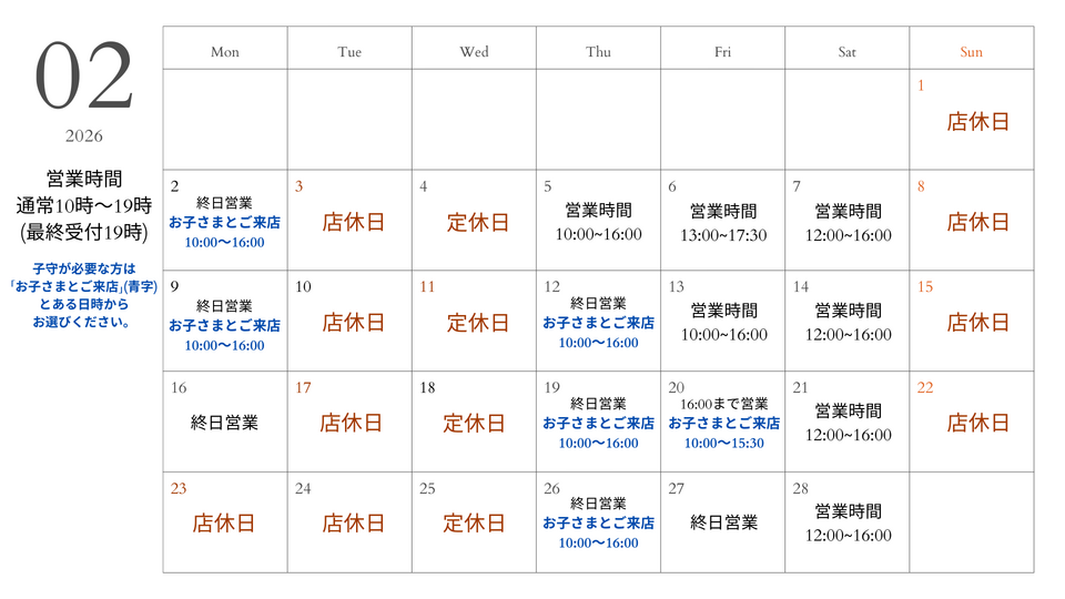 2月の営業日時などのお知らせをさせていただきます♡