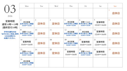 カレンダーに青字で表示した日時でしたらスタッフ二人が揃っています。