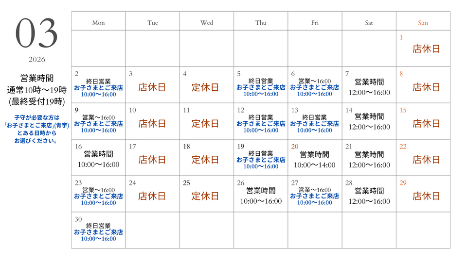 ※子守が必要ではないお子さまとのご来店は他の日時でも構いませんが