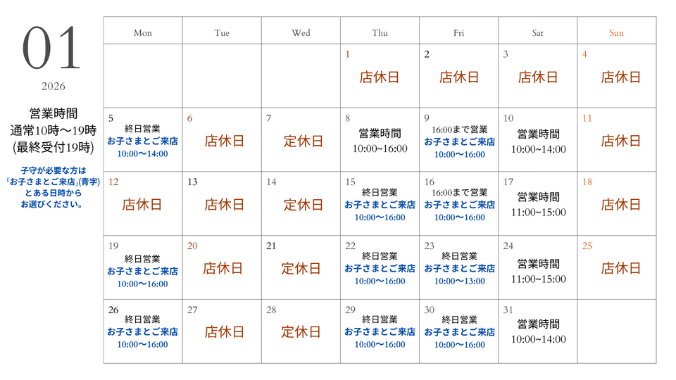 ※子守が必要ではないお子さまとのご来店は他の日時でも構いませんが