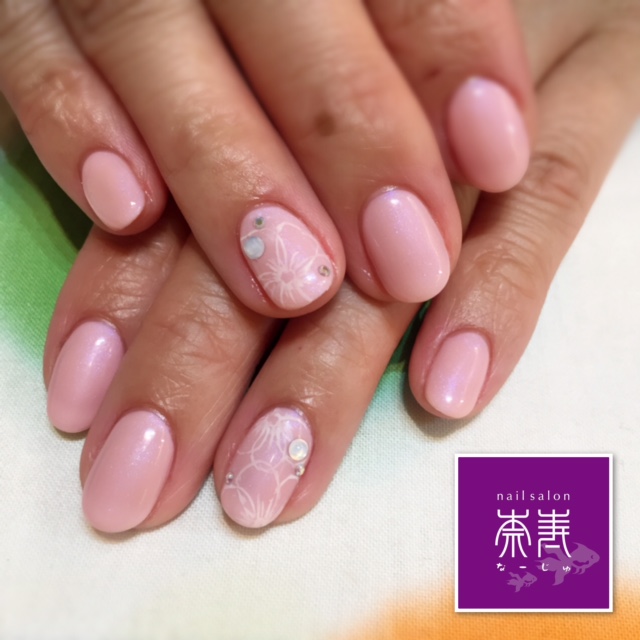 優しいピンクのワンカラーにホワイトでお花を描きました。