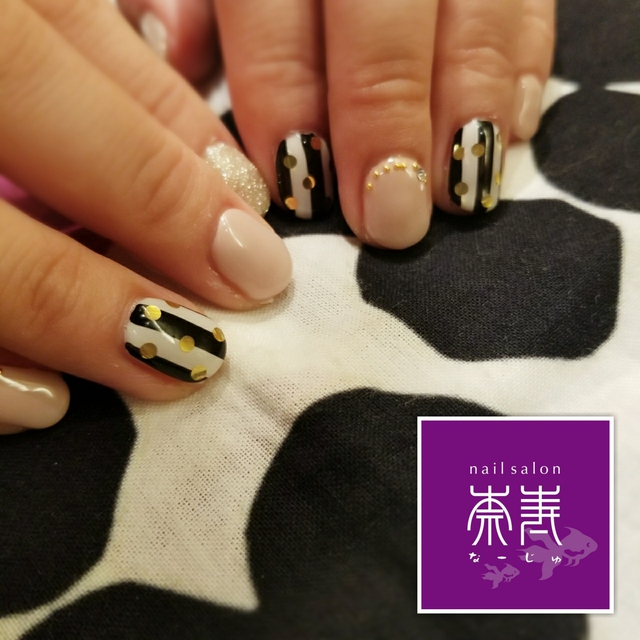 ネイルギャラリー 35億?(笑)なオトナネイル ストライプネイル・ホログラム 白と黒のストライプで35億を連想してしまう?大人な女性らしいネイルです!今回は光沢仕上げですが、マットにしてもかわいいですよね。