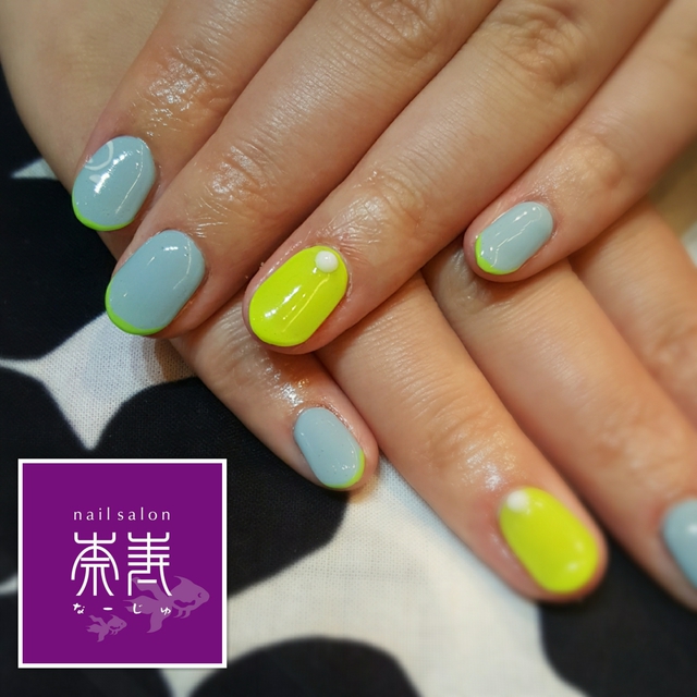 ネイルギャラリー さりげなくBIGBANGネイル☆ 極細フレンチ BIGBANGファンにおすすめのネイル! ひそかにさりげなくKRUNKベアを描いています♡ ベースは水色とグレー、どちらにも見えるようなカラーを作りました。 ネオンイエローと相性がいいお色です。