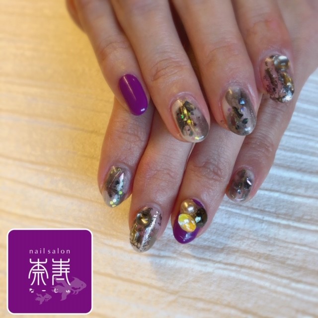 ホイルやシェルを使ったニュアンスネイルとホイルネイル、密かに新色のパープルにはイエロー、ブラックのVカットストーン、ゴールドパール⭐︎