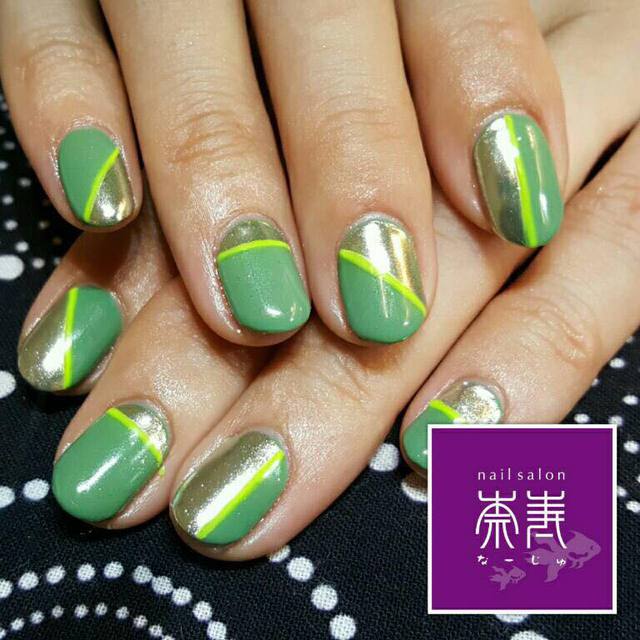 カーキのワンカラーにメタリックなシルバーをランダムにのせ、